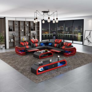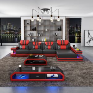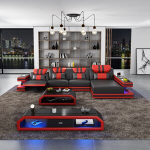 Lightspeed LED Modern Sectional Black Red Italian Leather