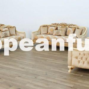 The Angelica sofa set with antique beige gold leaf finish. It is available in a wide range of fabrics and finishes
