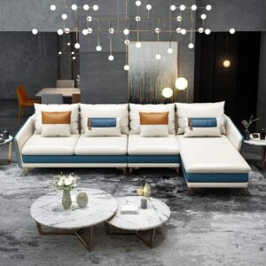 Icaro Sectional designed with beautiful 2 tone leather upholstered in a top grain Italian leather all around, and prominently features gold stainless steel legs and trim. Italian Leather sectional sofa set fashionable and stylish in 2 tone colors, seats and backs have high density foam to give you extra comfort and support. Available in white-orange, white-blue and camel-grey, also left or right configuration