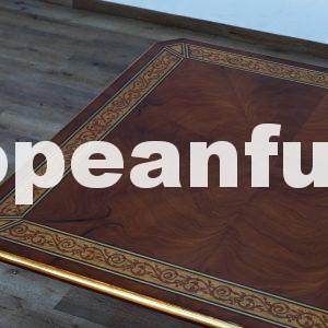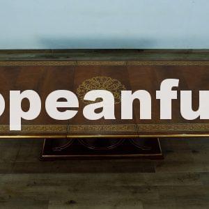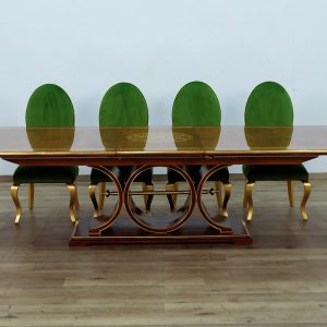 The spectacular top of the Rosella Dining set is decorated with mahogany swirl veneers in a sunburst design and maple inlay . The base are contrast interior circle in Deco gold leaf finish. With the addition of one 21″ leaves (included) the table can be expanded to seat ten, the leaves storage under table top. The Rosella Dining Table works beautifully with Upholstered Back Chair available upholstered in our vast of range choice fabrics including velvet, Emerald green, Red burgundy and charcoal gray fabrics