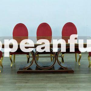 The spectacular top of the Rosella Dining set is decorated with mahogany swirl veneers in a sunburst design and maple inlay . The base are contrast interior circle in Deco gold leaf finish. With the addition of one 21″ leaves (included) the table can be expanded to seat ten, the leaves storage under table top. The Rosella Dining Table works beautifully with Upholstered Back Chair available upholstered in our vast of range choice fabrics including velvet, Emerald green, Red burgundy and charcoal gray fabrics