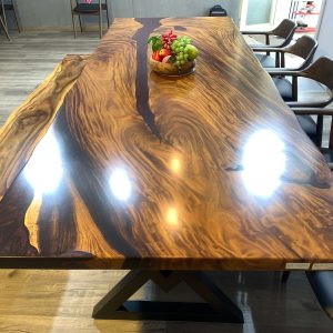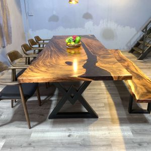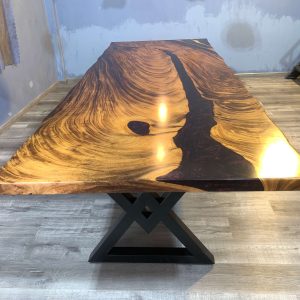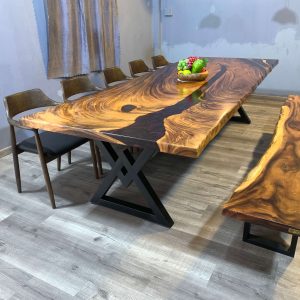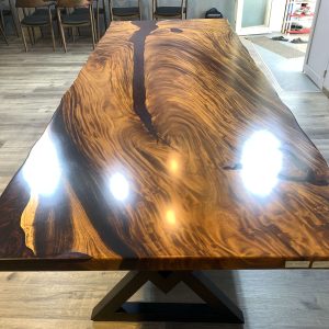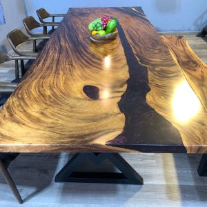 European Furniture Collection is one of the exclusive designers and producers of luxury handmade Live edge and Epoxy dining tables. All of the products based on large solid slap wood and epoxy resin are one of a kind. For each unique piece, European Furniture Collection uses high-quality epoxy resin along with carefully selected 100- to 350-year-old Monkey Pod, Sour and walnut wood and olive tree slabs to create unique, one-of-a-kind statement pieces. Because of the uniqueness of the wood shape and patterns this table is one of a kind and never can be reproduced 100% the same. We have some more slabs from the same wood and we can create a customized tables or desks that fits your requirements for size, height, resin color and legs. European Furniture Collection is one of the exclusive designers and producers of luxury handmade Live edge and Epoxy dining tables. All of the products based on wood and epoxy resin are one of a kind