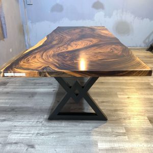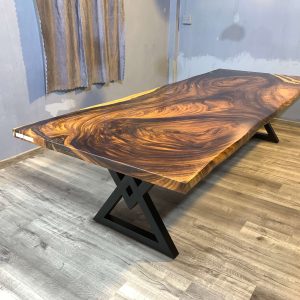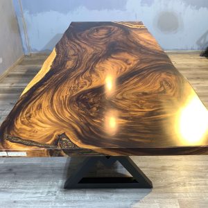 European Furniture Collection is one of the exclusive designers and producers of luxury handmade Live edge and Epoxy dining tables. All of the products based on large solid slap wood and epoxy resin are one of a kind. For each unique piece, European Furniture Collection uses high-quality epoxy resin along with carefully selected 100- to 350-year-old Monkey Pod, Sour and walnut wood and olive tree slabs to create unique, one-of-a-kind statement pieces. Because of the uniqueness of the wood shape and patterns this table is one of a kind and never can be reproduced 100% the same. We have some more slabs from the same wood and we can create a customized tables or desks that fits your requirements for size, height, resin color and legs. European Furniture Collection is one of the exclusive designers and producers of luxury handmade Live edge and Epoxy dining tables. All of the products based on wood and epoxy resin are one of a kind