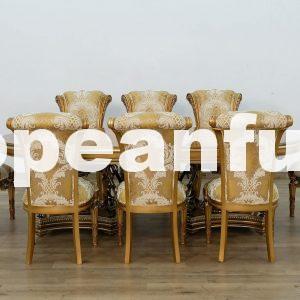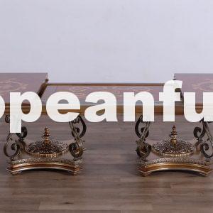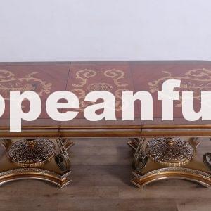 European Furniture has created a piece which, as well as being an extraordinary example of refinement, also has an unusual patented extension which takes nothing away from the beauty of the whole piece. It has marvellous inlays with numerous precious woods. The prestigious and majestic table is customizable, both in size and shape. The table top is decorated with inlaid mahogany, Ebony, Maple veneers while the basements are carved in solid mahogany wood and iron.