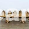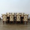 With the Valentine dining set collection, European furniture wants to show off its expertise in completely hand-crafted and gold leafs decorations. The richness of the decorations, the sumptuousness of the exquisite, refined details and the magnificence of the collection in its entirety recall the opulence typical of Baroque furniture, interpreted by the designer with designs and decorations that allude to the elegance of classic Deco style. The Valentine luxury collection, hand realized by famous artisans. Inspired to the Italian style, this great classic dining is enriched by precious carvings with gold leaf finish and covered of hi end polyester and multi jacquard fabric