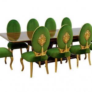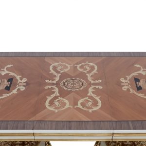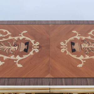 European Furniture has created a piece which, as well as being an extraordinary example of refinement, also has an unusual patented extension which takes nothing away from the beauty of the whole piece. It has marvelous inlays with numerous precious woods.