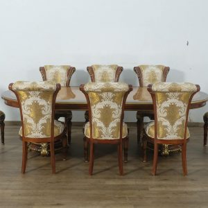 The richness of the decorations, the sumptuousness of the exquisite, refined details and the magnificence of the collection in its entirety recall the opulence typical of Baroque furniture, interpreted by the designer with designs and decorations that allude to the elegance of classic Deco style. The classic dining of the Veronica luxury collection, hand realized by Italian artisans. Inspired to the Italian style, this great classic sofa is enriched by precious carvings with gold leaf finish and upholstered of Luxury fabric.