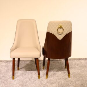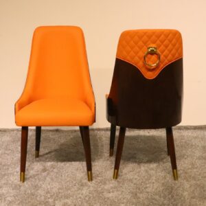 This Vogue Lux Dining chair is gorgeously crafted in premium material all around. The Vogue dining chair comfort and relaxation which combines elegant clean lines and décor gold stainless steel legs, with functionality for a sophisticated look. This modern dining chair fashionable and stylish with veneer Mahogany wood design on back, Available in Beige & Chocolate, Gray, Orange & Beige